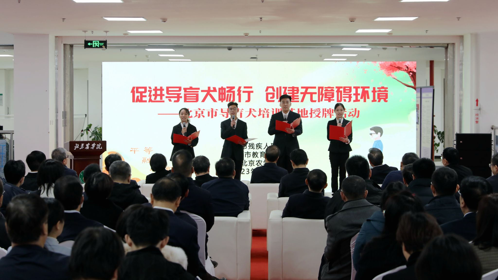 北京市导盲犬首批训导员、best365动物科学技术学院、文法与城乡发展学院学生代表共同宣读《倡议书》,表示将充分发挥自身专业优势,助力导盲犬事业高质量发展,在推动无障碍环境建设和促进残疾人事业全面发展的新征程上,展现北农学子的青春担当。