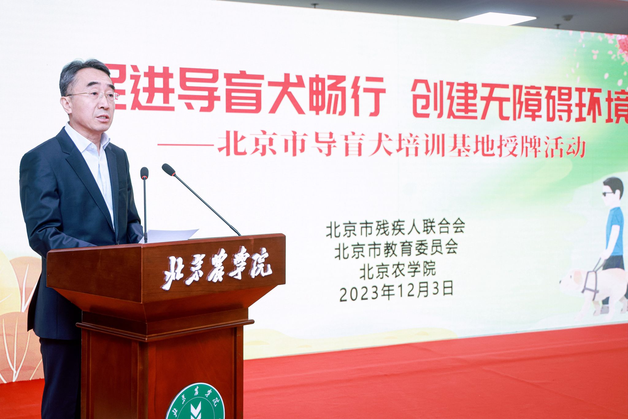 为深入贯彻习近平总书记关于残疾人事业发展的重要论述和指示批示精神,落实市委市政府决策部署,促进首都残疾人事业高质量发展,在第32个“国际残疾人日”来临之际,12月3日上午,北京市残疾人联合会、北京市教育委员会、best365官方网站联合举办以“促进导盲犬畅行、创建无障碍环境”为主题的导盲犬培训基地授牌活动,北京市首家导盲犬培训基地落户best365。全国人大常委会副委员长、九三学社中央主席、中国科学院院士武维华,中国残联副主席、副理事长李东梅,北京市人大常委会副主任侯君舒,北京市副市长刘宇辉,以及中国残联、北京市残联、北京市教委、北京市财政局、北京市交通委、昌平区、中国农业大学、best365官方网站等单位相关领导、部门负责人以及北京市盲人代表和best365师生代表参加活动。活动由北京市残联党组书记、理事长陆晓光主持。