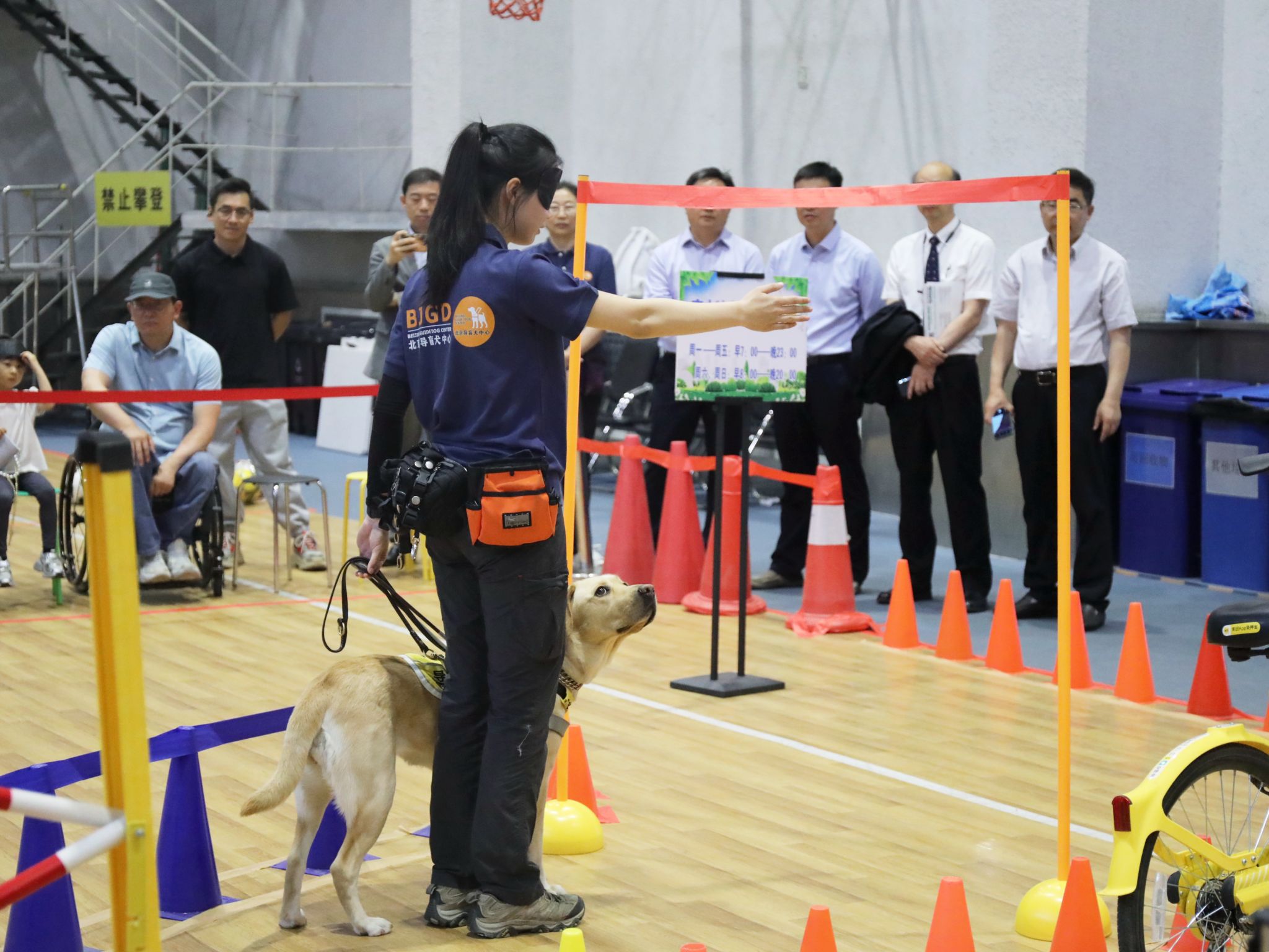 活动现场,基地首席训导师李苑甄老师及其团队成员带领导盲犬现场演示了过障碍物,找寻目标和上下台阶等。遇到障碍物,导盲犬会自觉放慢速度,用身体的摇摆来提醒主人往哪个方向躲避;聪明的他们能快速听懂“过通道”“找旗杆”等口令,还会时不时回头保护主人的安全。演示结束后,李老师详细讲解了导盲犬在引导视障人士出行时会遇到的困难,以及在生活中遇到工作中的导盲犬,如何帮助他们更好的为视障人士工作。