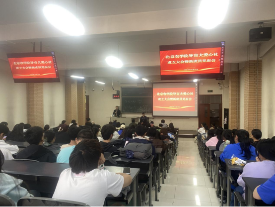 2024年10月15日, 导盲犬爱心社成立大会暨新成员见面会在教B102举行,动科学院副院长李国政、陈武教授、段慧琴副教授及社团成员150余人参加。