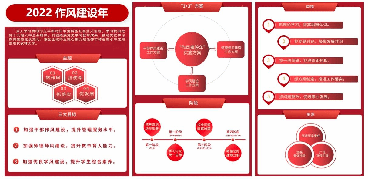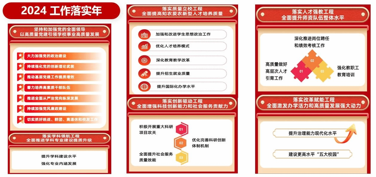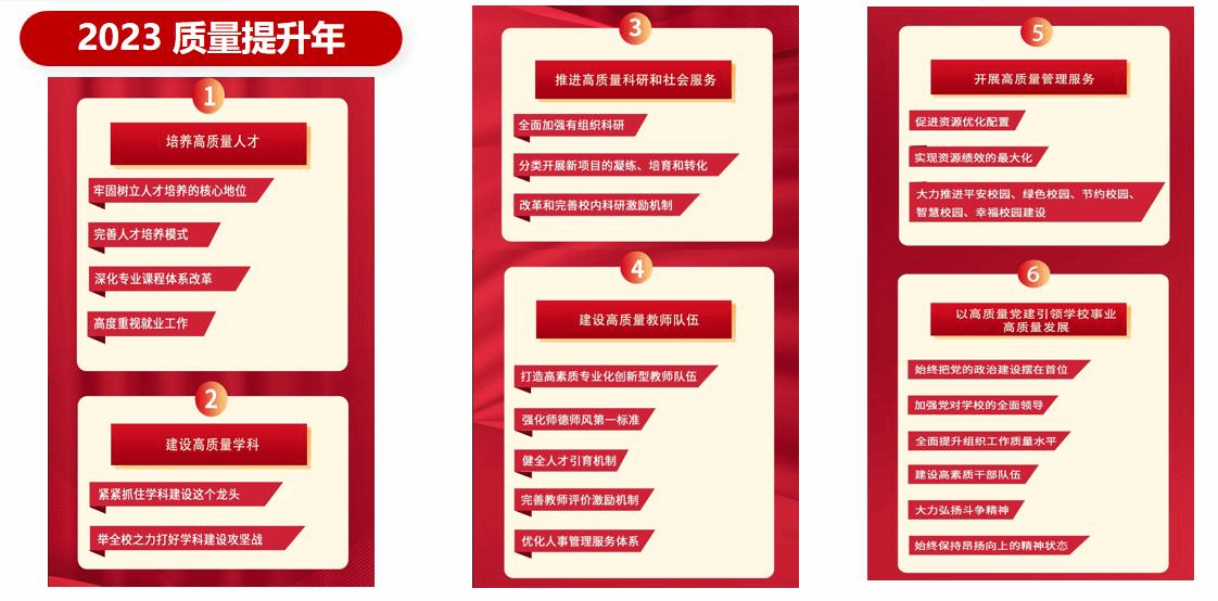 学校大力加强作风建设,以优良作风推动高质量发展。面对历史遗留问题、现实难题和群众反映强烈的问题,学校党委以“转作风、担使命、抓落实、促发展”为主题,将2022年确定为“作风建设年”,全面加强干部作风、师德师风、教风学风,大力树正气、树榜样、树典型,整治不作为、慢作为、乱作为,取得了突出成效。在“作风建设年”基础上,我们牢牢把握高质量发展这个新时代的硬道理,以“深化作风建设,推动高质量发展”为主题,将2023年确定为“质量提升年”,全力推动学校发展进入“快车道”。今年我们又以“狠抓工作落实,推动高质量发展”为主题,将2024年确定“工作落实年”,在全校上下迅速形成了真抓实干、力求实效的良好氛围。近年来,学校风清气正、干事创业、担当作为的氛围更加浓厚,人心思齐、人心思进、人心思干的势头明显增强。
