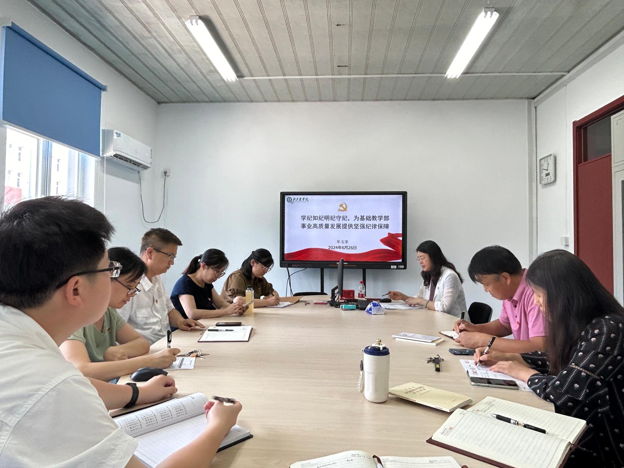 为切实加强党员干部纪律意识与规矩意识,按照党纪学习教育工作安排,6月26日中午,党总支书记牟玉荣以《学纪知纪明纪守纪,为基础教学部事业高质量发展提供坚强纪律保障》为题,讲授党纪学习教育专题党课。基础部班子成员、党总支委员、党支部书记、支部委员、党风廉政建设监督员、预备党员和入党积极分子参加。