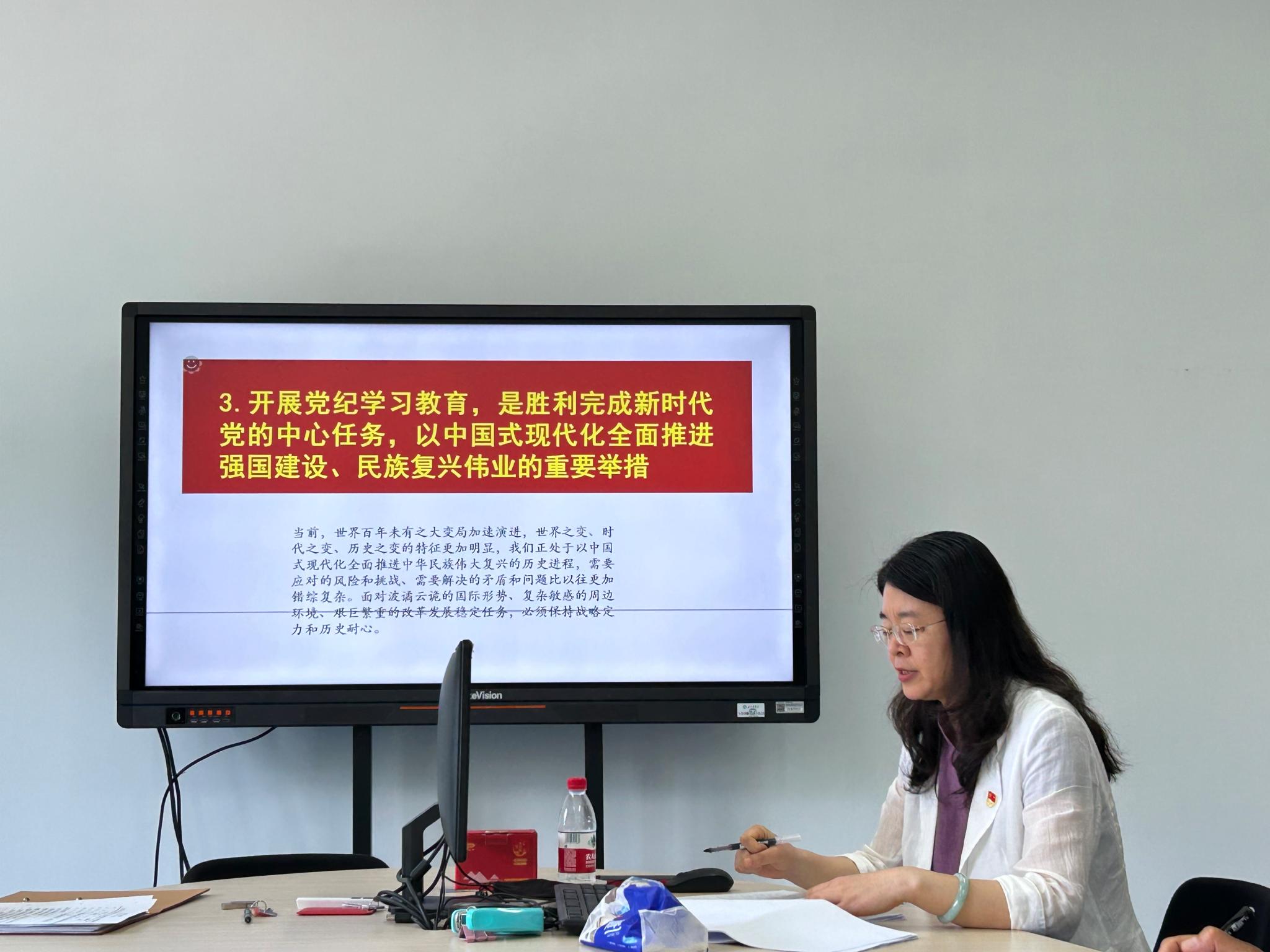 牟玉荣同志结合自身学习体会和基础教学部工作实际,围绕“提高政治站位、深化思想认识,深刻认识加强党的纪律建设的重要意义”“强化政治责任,把握重点,准确领会‘六项纪律’的主旨要义和规定要求”“注重学用结合,将党纪学习教育成果转化为推进工作高质量发展的实际成效”三个方面展开讲述。牟玉荣指出,开展党纪学习教育是弘扬我们党重视纪律建设的光荣传统;是全面贯彻落实自我革命的重要思想,纵深推进全面从严治党的重要举措;是胜利完成新时代党的中心任务,以中国式现代化全面推进强国建设、民族复兴伟业的重要举措;是增强党员干部纪律观念和纪律自觉的有效举措,提高党员党性修养的必然要求。