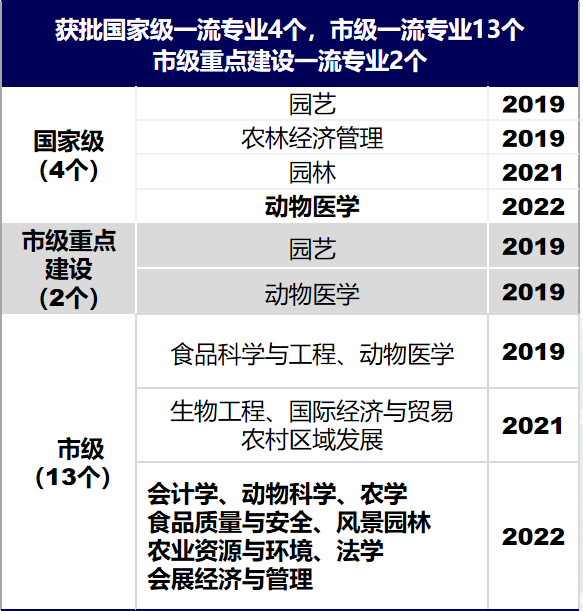 积极推进学科专业供给侧结构性改革,新增一级学科硕士学位授权点4个、专业学位硕士授权点3个,园艺学获批北京高校高精尖建设学科,学校获批北京市新增博士学位授予立项建设单位,3个一级学科列入北京市博士点建设计划。专业建设卓有成效,增设4个新专业、3个专业方向,停招7个专业。获批全国首个培养古树保护本科专业人才单位,获批4个国家级一流本科专业建设点、13个北京市级一流本科专业建设点、2个北京高校重点建设一流专业。