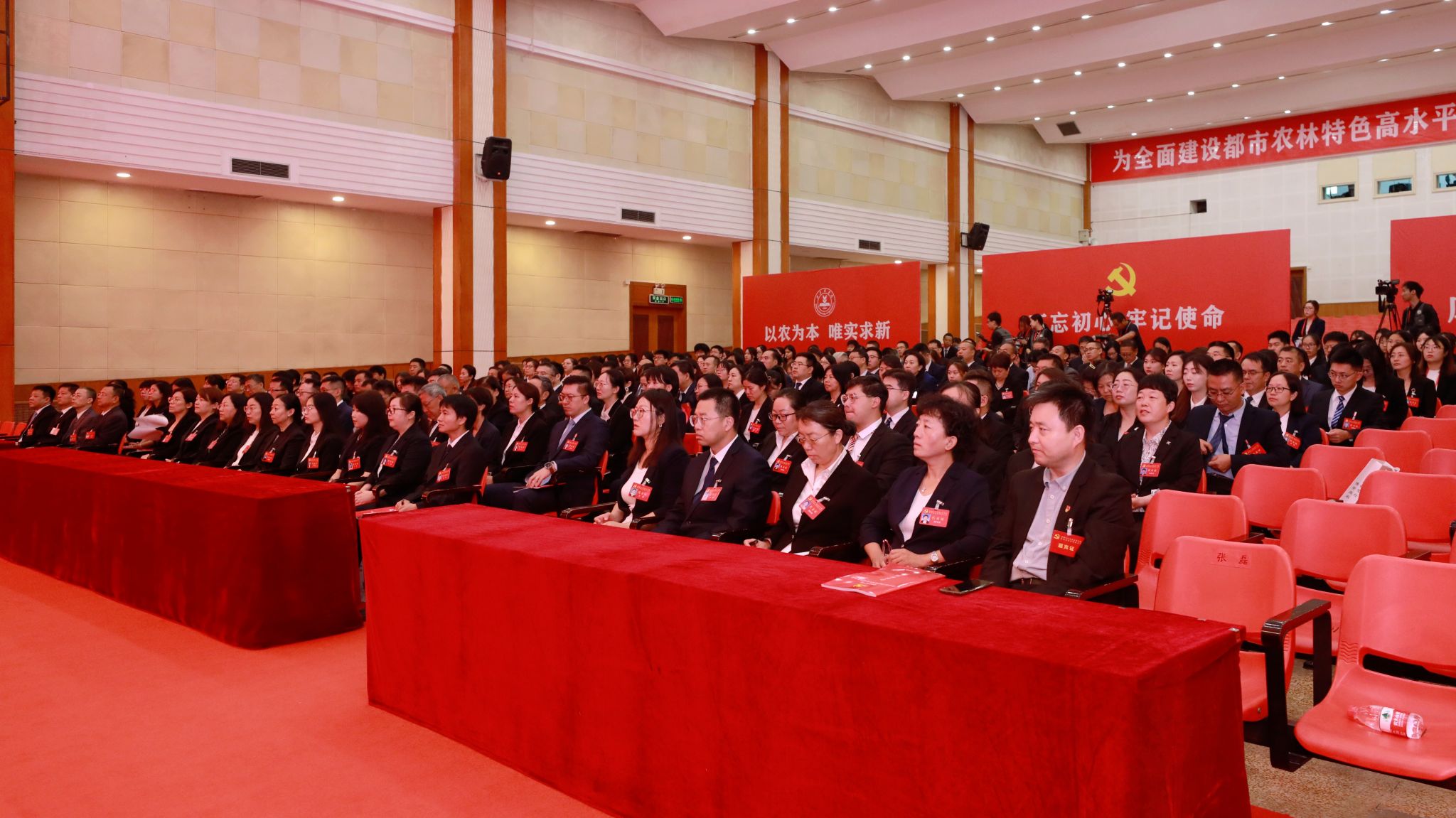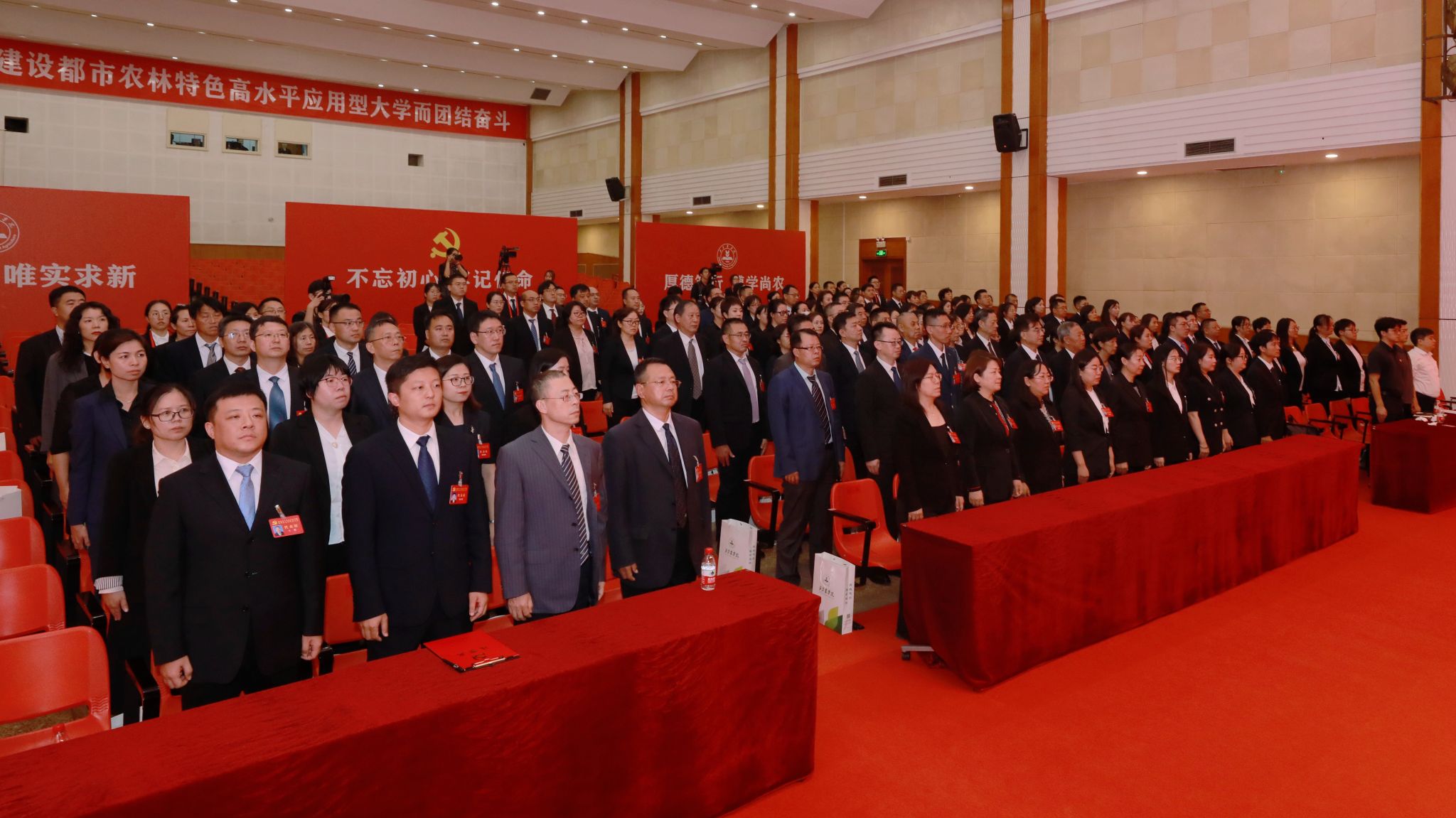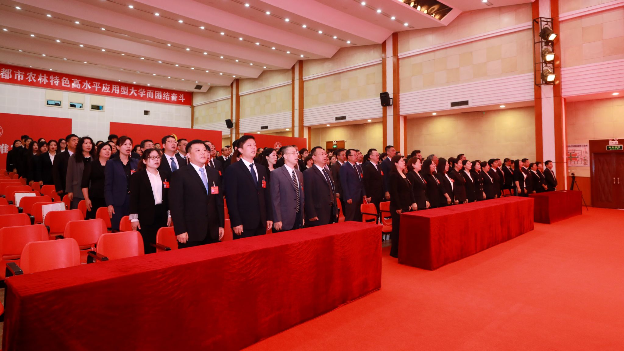大会会场内气氛庄重热烈,主席台正中是由镰刀和锤头组成的中国共产党党徽,十面红旗分列两侧。大会会场后方,写有“为全面建设都市农林特色高水平应用型大学而团结奋斗”的横幅格外醒目。