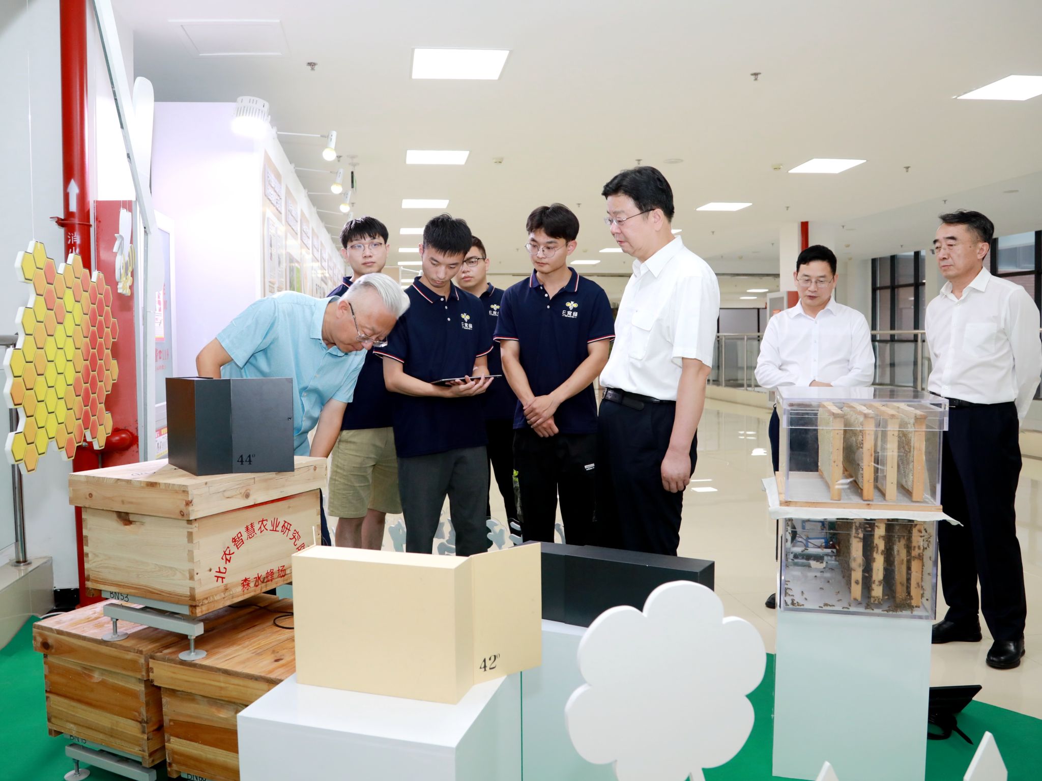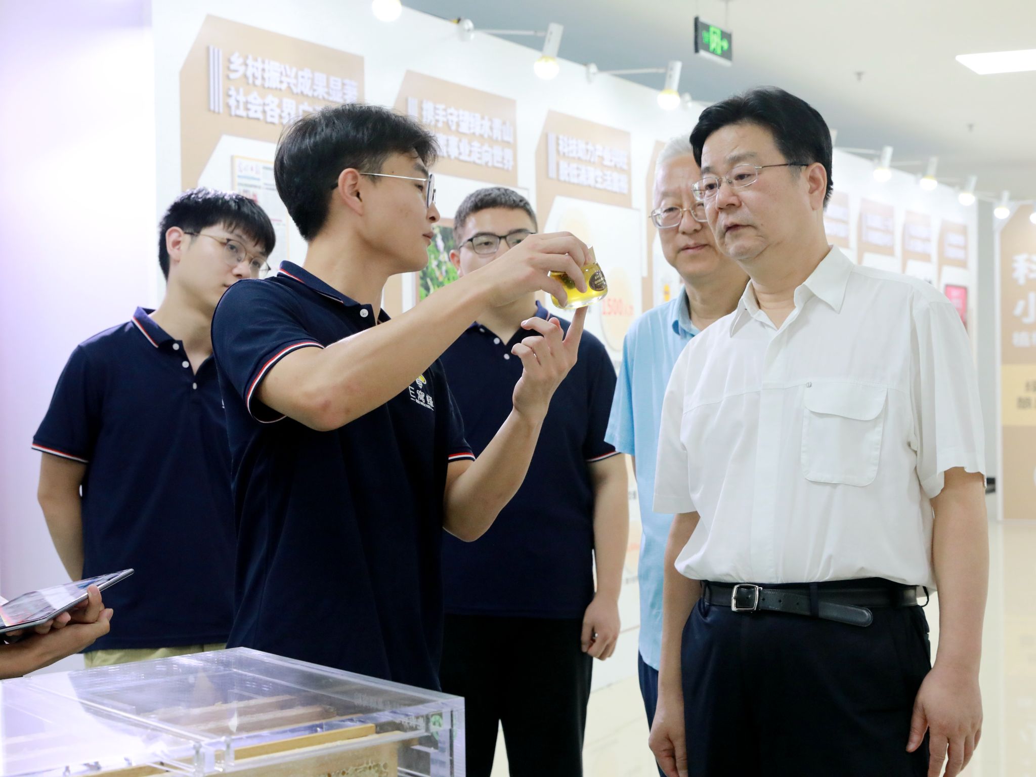 在best365官方网站科技小院“北农智慧蜂场”展区,游钧听取了科技小院发挥专业优势、扎根房山蒲洼,建设智慧蜂场、用科技助力乡村振兴的做法。该科技小院的5名同学暑期开展服务乡村振兴社会实践时因暴雨被困蒲洼科技小院,在市委教育工委、地方政府和学校多方努力下,第一时间安全返回校园。游钧亲切询问同学们现在的学习、生活情况,得知他们已经重返科技小院,帮助蜂农采收蜂蜜,助力农民增收致富,游钧给予充分肯定,并鼓励他们继续扎根基层一线,为乡村振兴贡献青春力量。