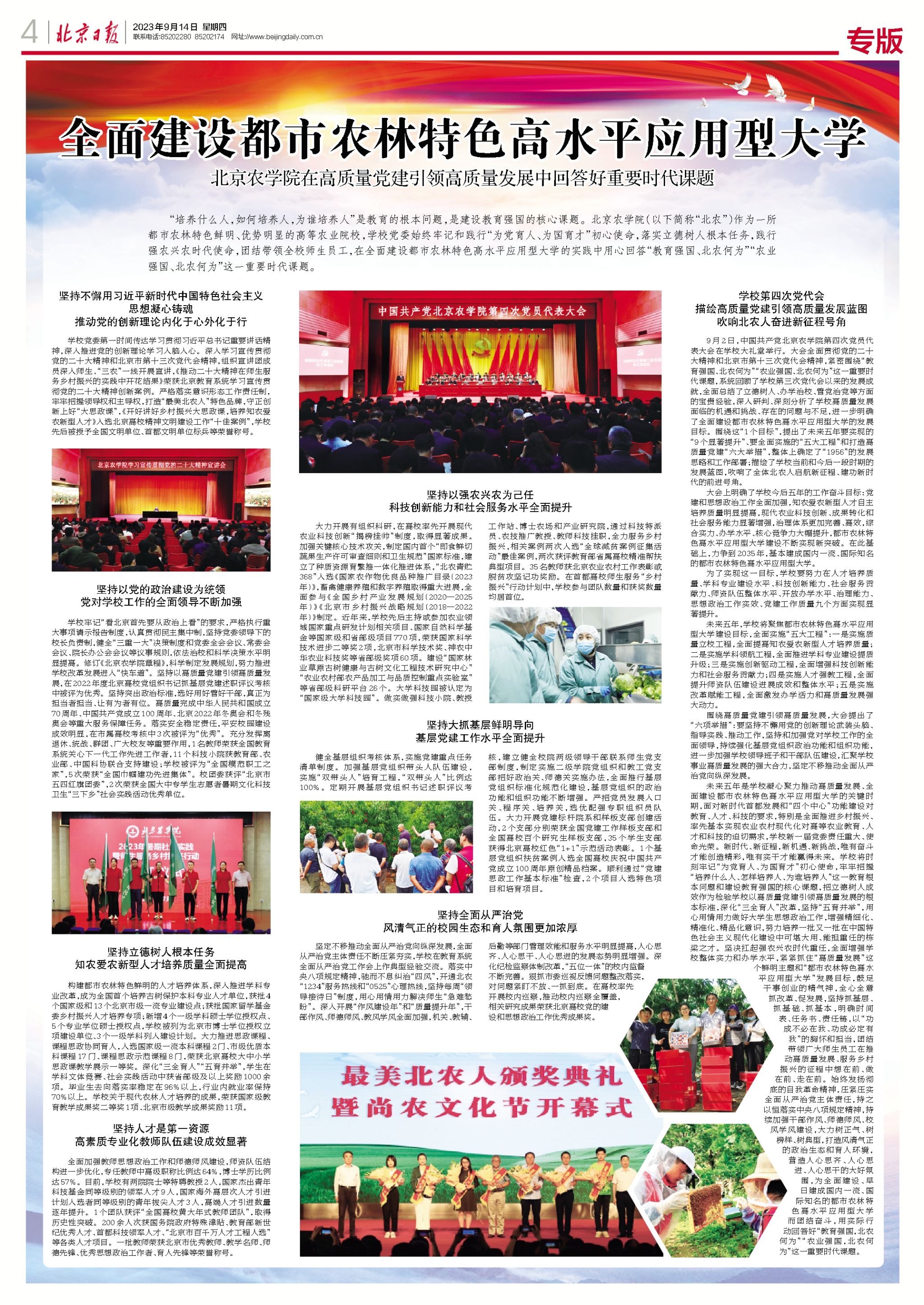 学校党委第一时间传达学习贯彻习近平总书记重要讲话精神,深入推进党的创新理论学习入脑入心。深入学习宣传贯彻党的二十大精神和北京市第十三次党代会精神,组织宣讲团成员深入师生、“三农”一线开展宣讲,《推动二十大精神在师生服务乡村振兴的实践中开花结果》荣获北京教育系统学习宣传贯彻党的二十大精神创新案例。严格落实意识形态工作责任制,牢牢把握领导权和主导权,打造“最美北农人”特色品牌,守正创新上好“大思政课”,《开好讲好乡村振兴“大思政课”,培养知农爱农新型人才》入选北京高校精神文明建设工作“十佳案例”,学校先后被授予全国文明单位、首都文明单位标兵等荣誉称号。