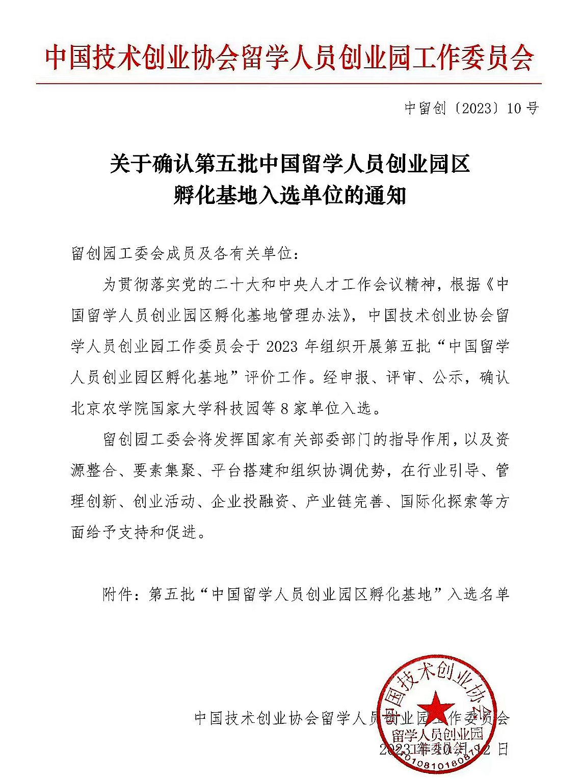 10月12日,中国技术创业协会留学人员创业园工作委员会发布《关于确认第五批中国留学人员创业园区孵化基地入选单位的通知》(中留创〔2023〕10号),best365官方网站国家大学科技园入选第五批“中国留学人员创业园区孵化基地”。