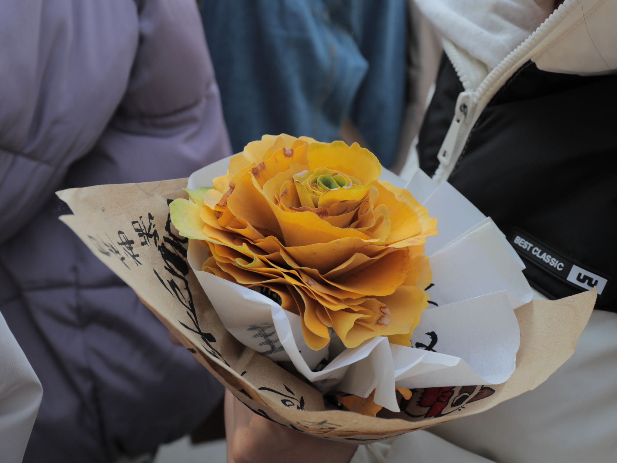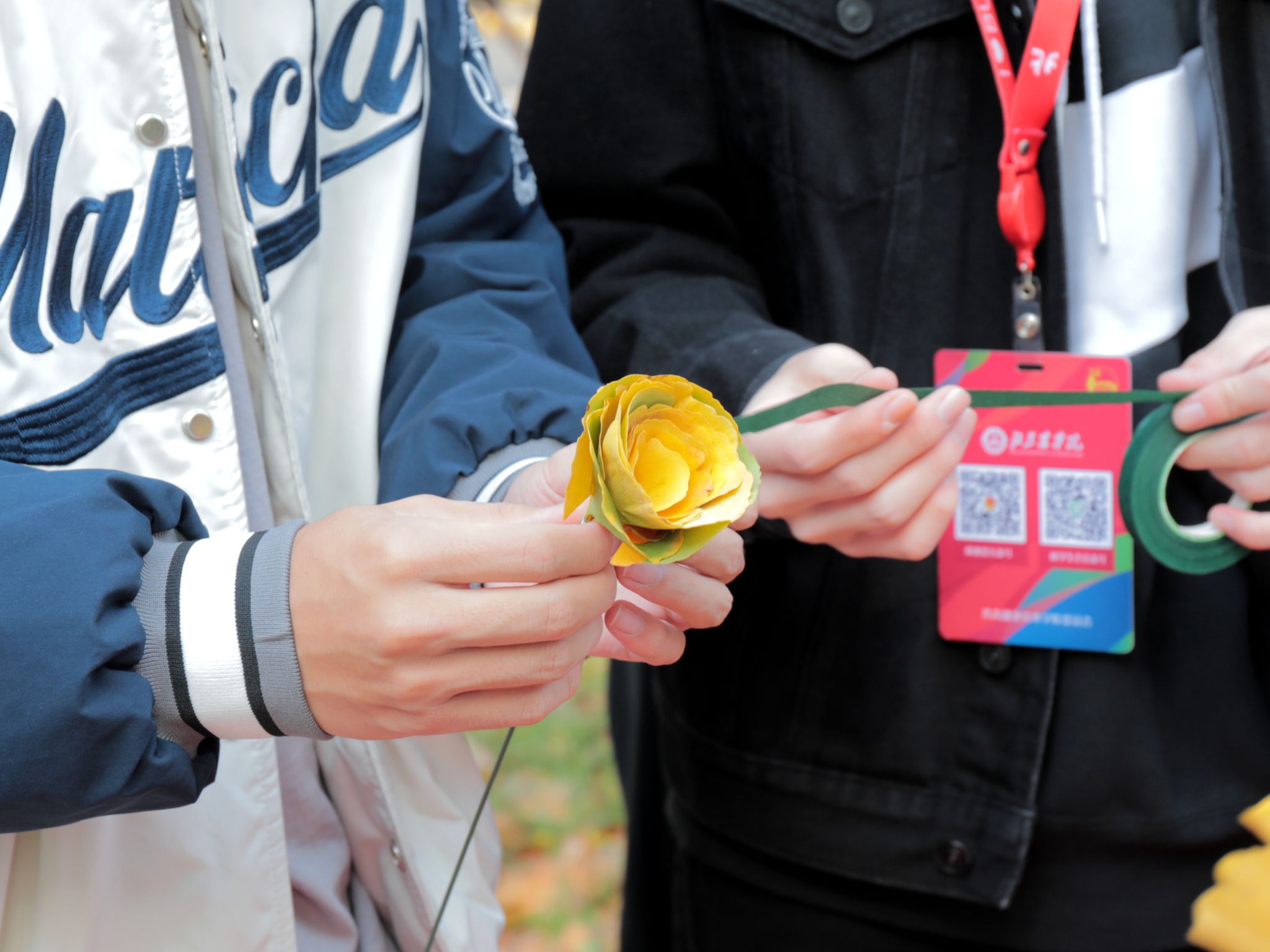 将落叶“变”成花,让灿烂的银杏叶又多了一份浪漫。同学们在专业人员的指导下纷纷学习如何制作银杏花束。“遍地的落叶从前只是拍照的背景,没有想过还可以变成绚烂的花束,”韩瑀譞同学惊叹于这个创意的巧妙,“这个活动启发我创意无止境,更让我体会到人与自然的和谐共生的美好。”