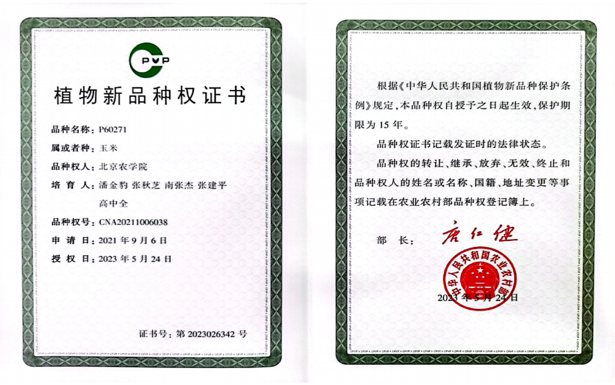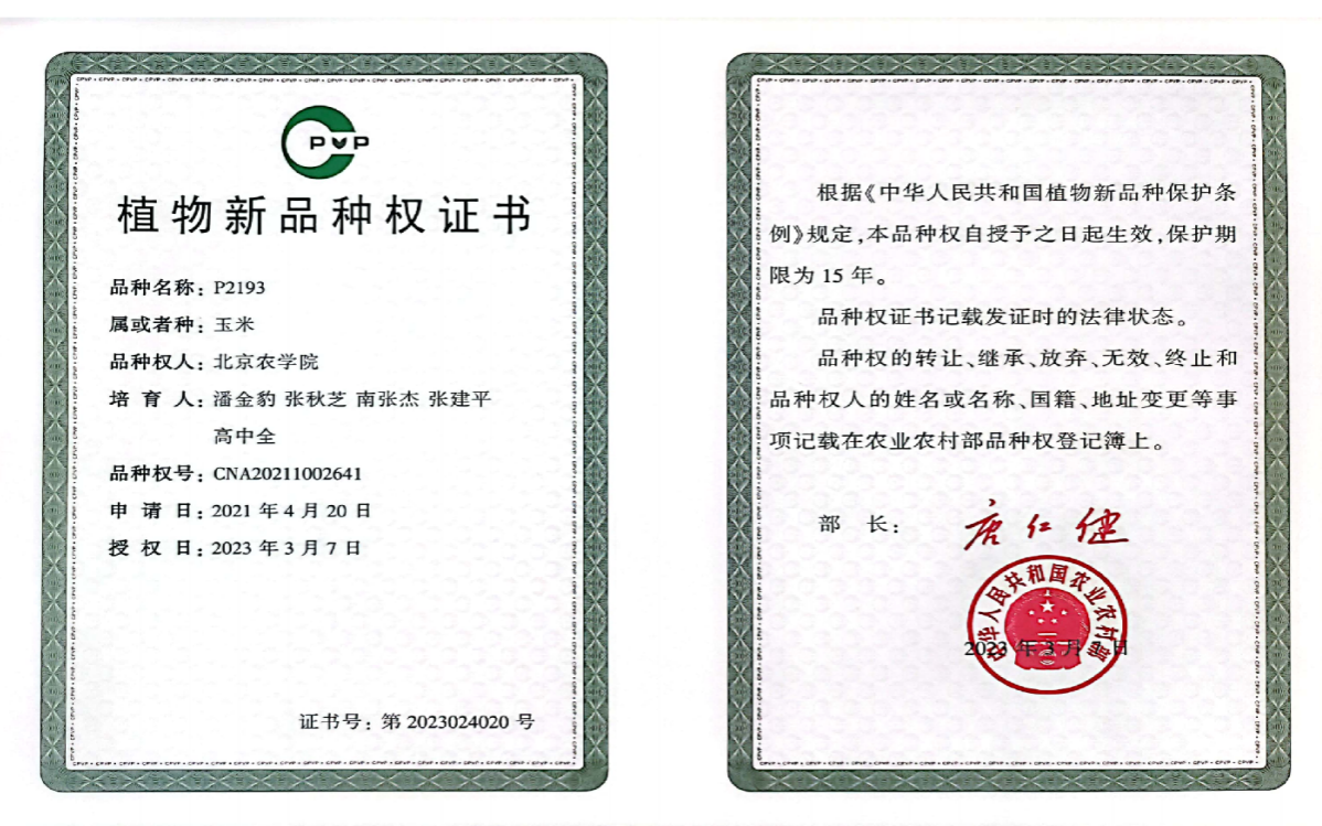 近日,best365青贮玉米团队种质资源创新取得重要突破,优良青贮玉米自交系P2193 、P60271获得国家植物新品种权证书。