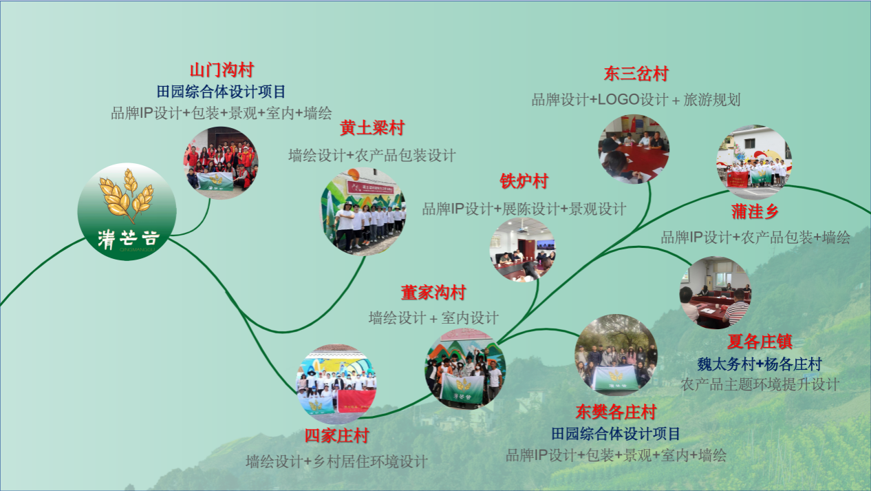 团队秉承“用文化唤醒乡土、以创意激活乡村、让宜居重归乡村”的理念,聚焦村庄需求,将文创设计根植于乡村传统文化,积极探索“以艺助农”的方式,形成可复制、可推广的“品牌设计+农产品包装设计+墙绘+环境设计+室内设计”为一体的“1+4”清芒谷助力乡村振兴模式。两年来,团队先后将这一模式推广应用到10余个村庄的乡村振兴实践中,通过多种艺术形式赋能乡村振兴,取得了丰硕成果。