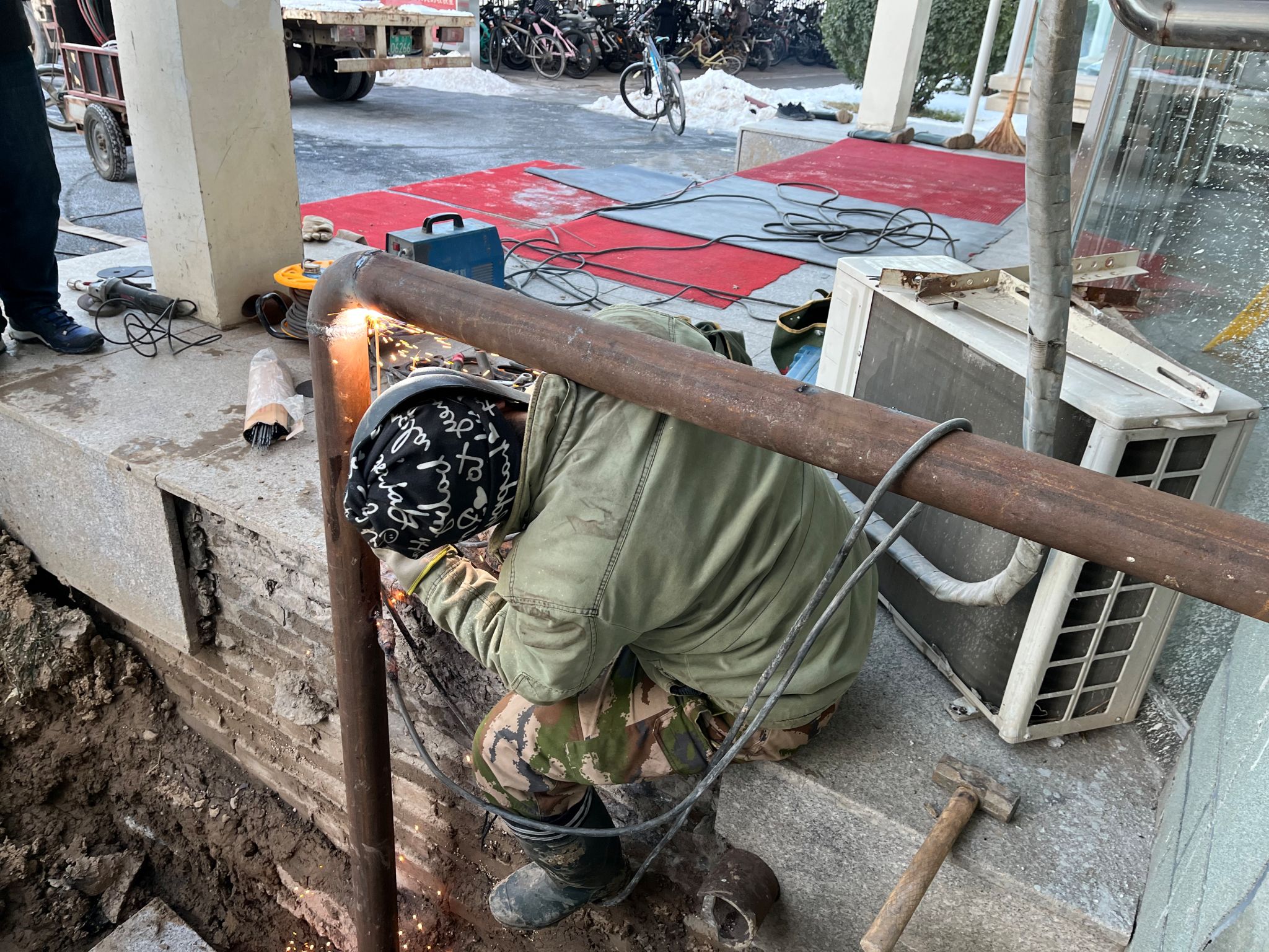 经过近两个小时的维修,进水管终于修好了。“不好,又有一处漏水!”刚松了一口气的师傅突然发现墙根处还有漏水点。漏水管道挨着墙体,无法直接进行焊接。“改变原有维修思路,从一楼值班室的主暖气管道接一根新的管道到室外暖气管。”由于坡口焊接的难度很大,维修师傅又经过三个多小时的安装和焊接,终于在下午4点多完成维修并恢复供水。