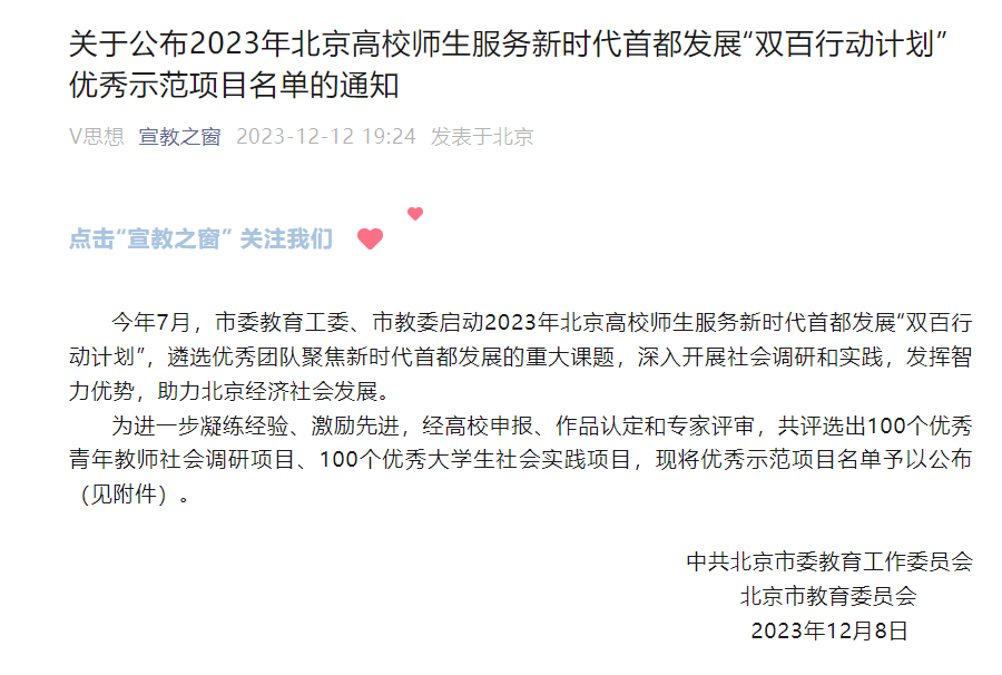 日前,北京市委教育工委、市教委公布了2023年北京高校师生服务新时代首都发展“双百行动计划”优秀示范项目名单,经高校申报、作品认定和专家评审环节,共评选出100个优秀青年教师社会调研项目和100个优秀大学生社会实践项目,best365推荐的6个项目全部入选。其中植物科学技术学院张卿副教授、文法与城乡发展学院常丽红副教授、园林学院朱强博士牵头申报的项目入选优秀示范项目(教师组),食品科学与工程学院本科生梅子雨、动物科学技术学院本科生张凌宇、园林学院本科生周思岐牵头申报的项目入选优秀示范项目(学生组)。