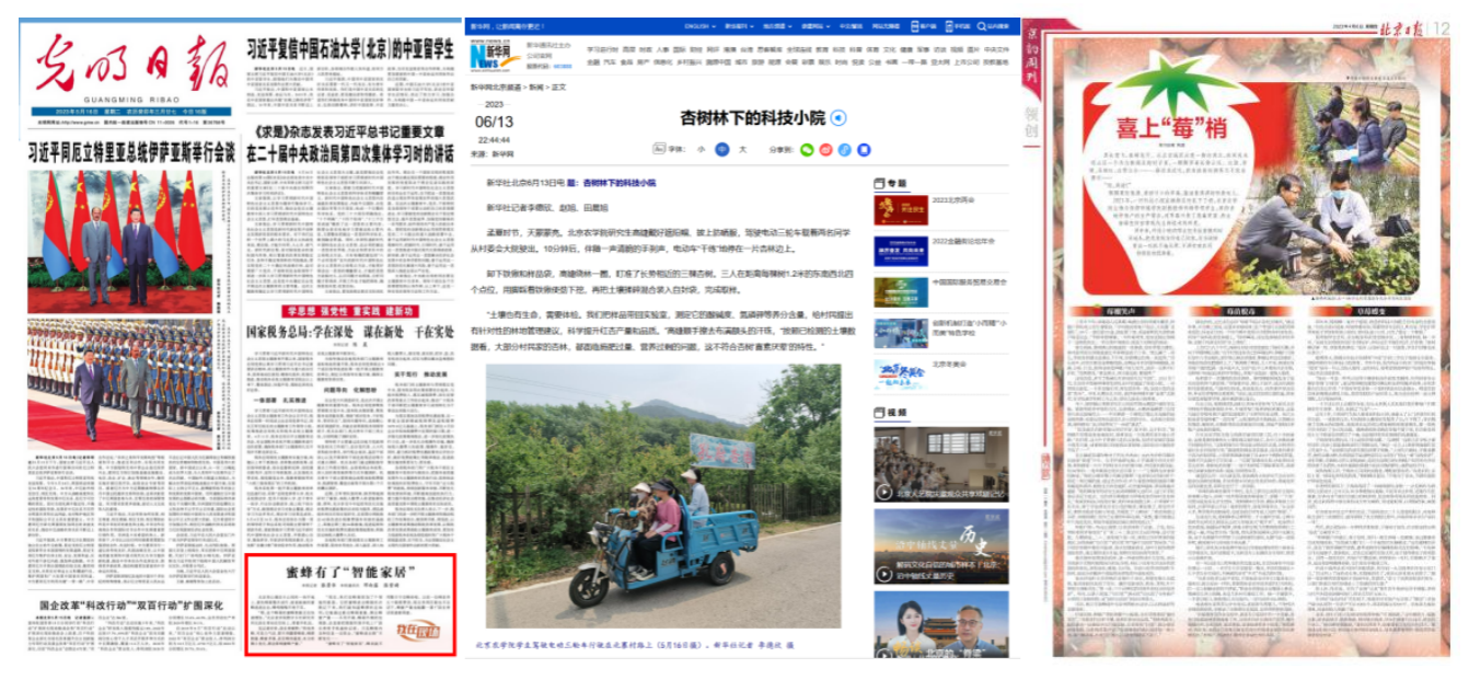 学校师生认真学习贯彻习近平总书记给中国农业大学科技小院同学们的回信精神,极大地增强了学农爱农、支农扶农、强农兴农的信心和决心。2023年5月,《光明日报》头版对best365科技小院师生助力房山蒲洼乡蜂农建设智慧蜂场的成效进行报道;6月,新华社对best365科技小院师生助力北寨红杏增产增收的做法进行深度报道;7月,北京电视台、《北京日报》对best365延庆浆果科技小院师生用科技助力草莓、软枣猕猴桃提质增收的事迹进行深入报道。