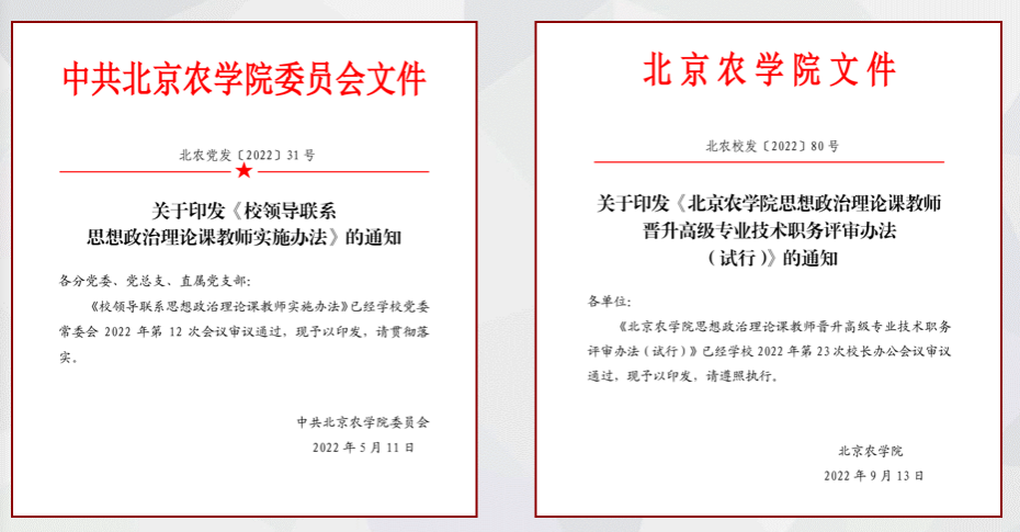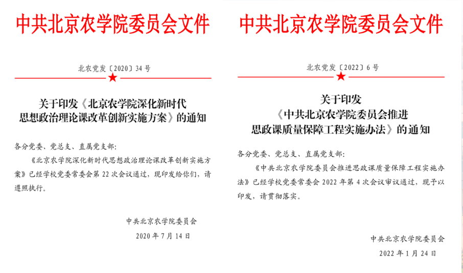 党委重视,强化思政课改革创新顶层设计。学校党委坚持以习近平新时代中国特色社会主义思想凝心铸魂,站在“培养什么人、怎样培养人、为谁培养人”的战略高度,深入思考和统筹推进新时代首都农林高校思政课改革创新,先后颁布《思想政治理论课教师队伍建设规划》《深化新时代思想政治理论课改革创新实施方案》《思政课质量保障工程实施办法》等一系列制度文件,从教学质量保障、评价机制建设、人才与师资队伍建设、资源整合等方面对深化思政课改革创新作出一系列部署。2023年9月,学校第四次党代会强调落实立德树人根本任务,打造具有“首善标准、红色基因、北农特色”的大思政课。学校党委坚持把思政课改革创新作为重要政治任务抓实抓牢,把思政课建设作为党的建设和意识形态工作的标志性工程纳入重要议程,列入学校年度党政重点工作和“十四五”发展规划,党委常委会每学期至少专题研究一次思政课建设,学校领导班子成员一对一联系思政课教师,带头深入课堂听思政课、讲思政课,督促指导马克思主义学院开好讲好《习近平新时代中国特色社会主义思想概论》课程,深入推进党的创新理论“三进”。