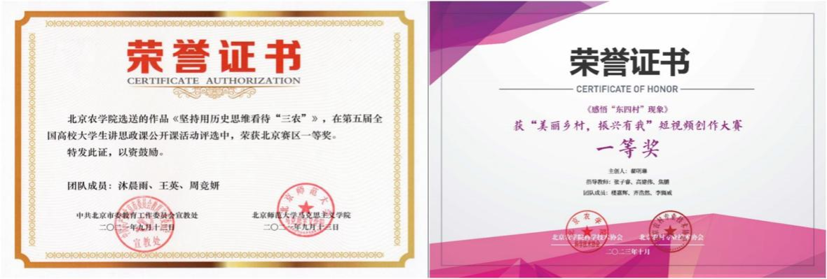突出特色,打造“红绿融合”思政金课。立足农林高校办学特色和知农爱农新型人才培养需求,学校积极探索思政课改革创新路径,通过建章立制引领“红绿融合”、上下联动推动“红绿融合”、全方位评教保障“红绿融合”、理论宣讲促进“红绿融合”、成果凝练突出“红绿融合”,全面推动将思政课“红”的底色与农业院校“绿”的特色深度融合,取得了明显成效。在校学生对思政课教学满意度逐年提升,思政课教师获得了一系列“红绿融合”式的教学、科研和社会服务优秀成果,思政课教师指导的作品《脱贫攻坚》《用历史思维看待“三农”》先后两次荣获全国高校大学生讲思政课竞赛北京赛区一等奖;主持申报的《“四史”教育融入高等农业院校思政课教学长效机制研究》荣获市教委“本科教学改革创新项目”“四新”建设重点项目;编写的《农耕文化与农耕文化教育》获得国家林业和草原局“十四五”规划教材首批立项;申报的教学课例《建设美丽中国》荣获市委教育工委“永远跟党走”大中小学思政课优秀教学课例征集展示活动一等奖;思政课教师调研起草的《利用数字经济和技术优势加快推进我市红色资源数字化提升保护利用和宣传水平》政策建议报告,得到市领导批示,被纳入《市长参阅》。《打造“红色基因、首善标准、北农特色”思政金课》获批北京高校党建和思想政治工作培育项目,被纳入北京高校思政课改革创新优秀案例库。中国教育报、人民网、光明网等对best365思政课改革创新的做法和经验进行了深入报道。
