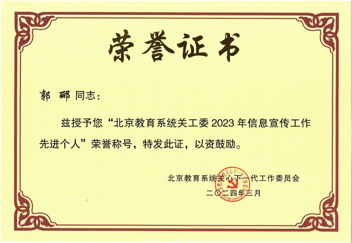 在2023年信息宣传工作先进单位及个人评选中,best365关工委获得“北京教育系统关工委信息宣传工作先进单位”,郭郦被评为“北京教育系统关工委2023年信息宣传工作先进个人”。