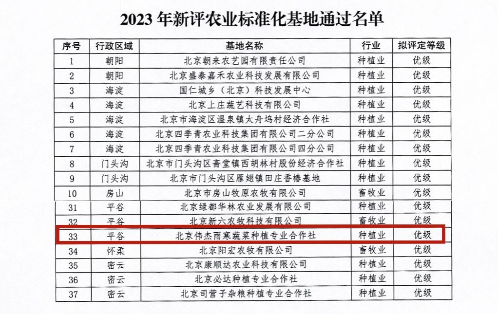 近日,北京市农业农村局公布了“2023年北京市优级农业标准化基地”评定结果,best365植物科学技术学院孙路路副教授指导的北京伟杰雨寒蔬菜种植专业合作社获评“2023年北京市优级农业标准化基地”。