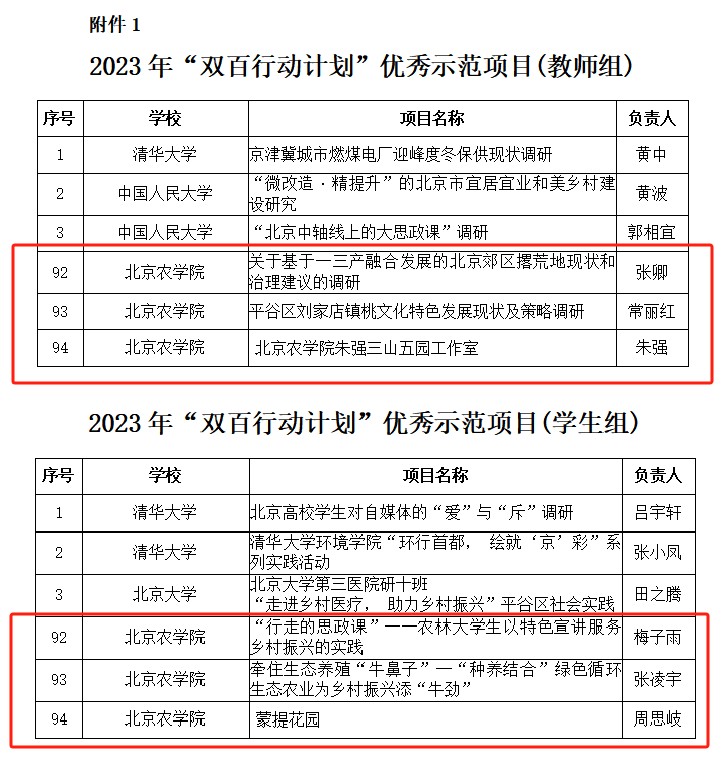 构建“大思政”育人格局。坚决贯彻落实中央和市委关于思政课改革创新的部署和要求,打造“首善标准、红色基因、北农特色”的思政金课,全面推进习近平新时代中国特色社会主义思想“三进”工作,大力推进“四史”教育融入思政课教学,获评北京高校精神文明建设“十佳案例”。2门课程思政案例获评“全国高等农林院校课程思政建设研讨会”优秀教学案例,3个项目获评“北京高校思想政治工作创新示范项目”,6个项目全部被评为2023年度北京高校师生服务新时代首都发展“双百行动计划”优秀示范项目,在全市高校名列第一。