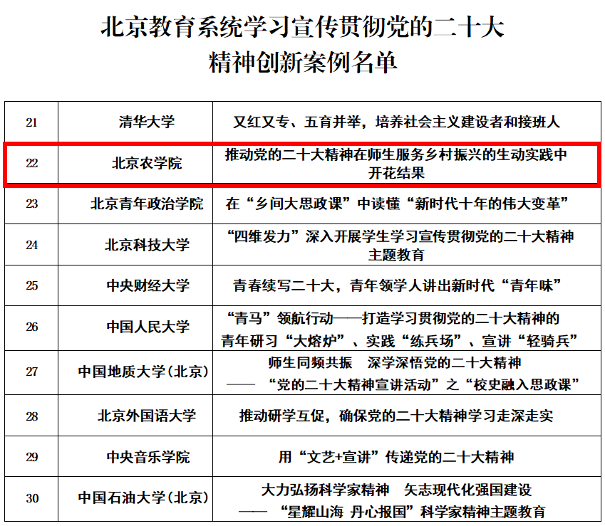 深入学习宣传贯彻党的二十大精神。高标准开展学习贯彻习近平新时代中国特色社会主义思想主题教育、党纪学习教育,持续在学懂弄通做实上下功夫。组织宣讲团深入师生、“三农”一线,大力宣传阐释新时代党的创新理论和党中央重大决策部署,并及时把师生的学习实践凝练成可推广的成果素材,组织申报的《推动党的二十大精神在师生服务乡村振兴的生动实践中开花结果》荣获北京教育系统学习贯彻党的二十大精神“创新案例”。《讲好用好新时代“大思政课” 打造助力乡村振兴的“北农样板”》获评“2023年度首都教育系统精神文明建设工作优秀案例”,学校教师在人民网、光明网等权威媒体发表理论文章10余篇,扎实推动党的二十大精神进教材、进课堂、进头脑,高质量开好讲好“习近平新时代中国特色社会主义思想概论”课。