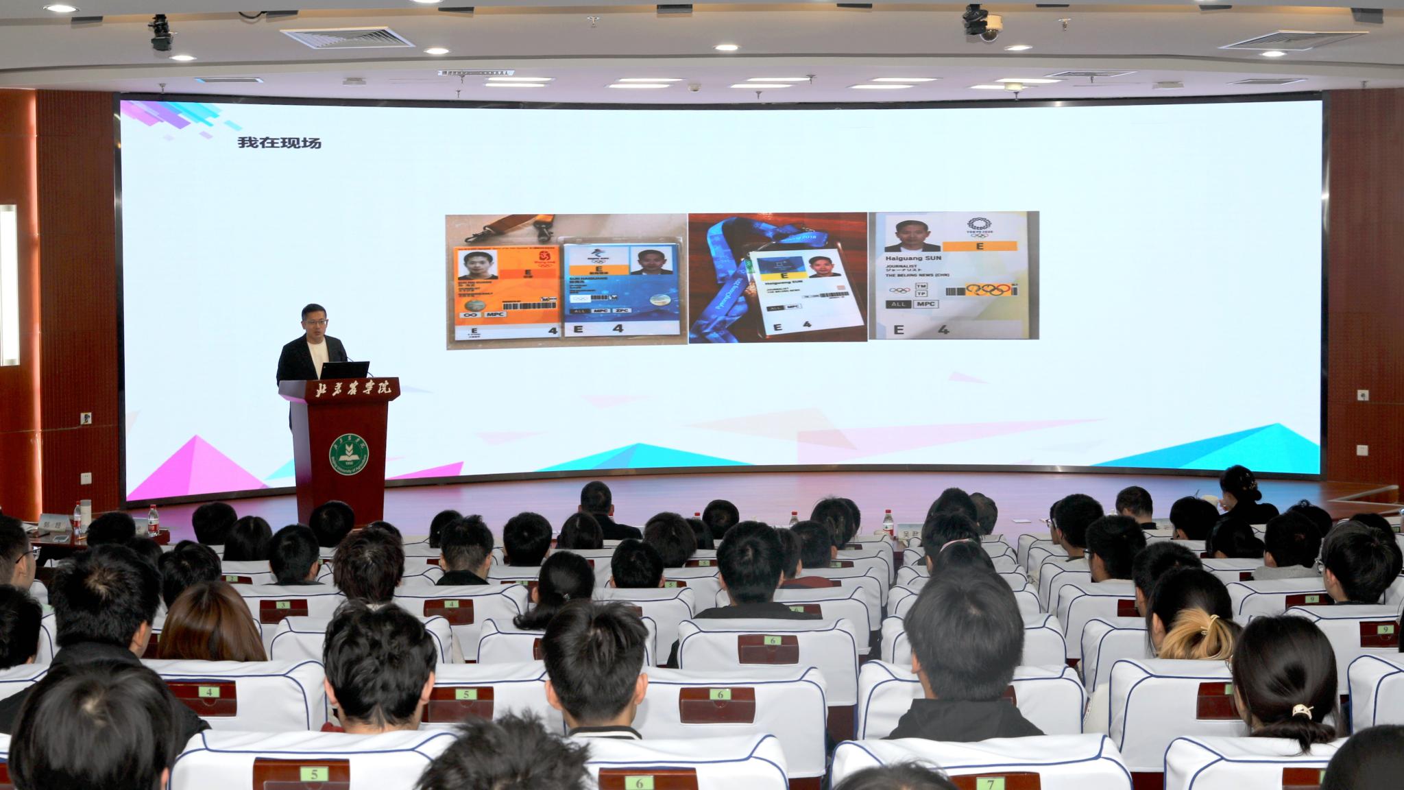 孙海光曾是2008年北京夏季奥运会、残奥会以及2022年北京冬季奥运会、残奥会的注册记者,在讲述自己参与奥运会的经历和感受之外,他还分享了运动员郑钦文和倪夏莲的拼搏故事。谈到“体育人生”带来的启发,他引用新中国体育界第一位世界冠军容国团一句话“人生能有几回搏,此时不搏更待何时?”与台下学子们共勉。