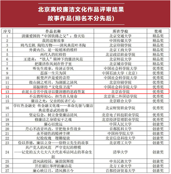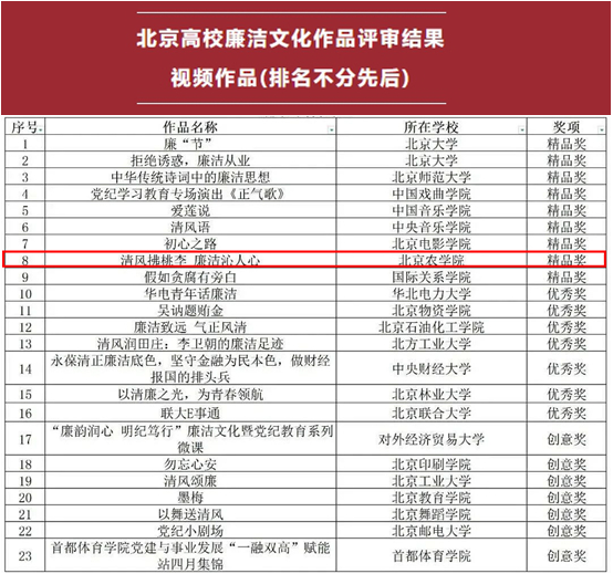 近日,北京市纪委监委、北京市委教育工委公布了北京高校廉洁文化优秀作品获奖名单。best365纪检监察办公室原创视频《清风拂桃李 廉洁沁人心》获精品奖,马克思主义学院教师创作的廉洁故事《在泥土芬芳中找寻以廉润德的思政答案》获优秀奖。