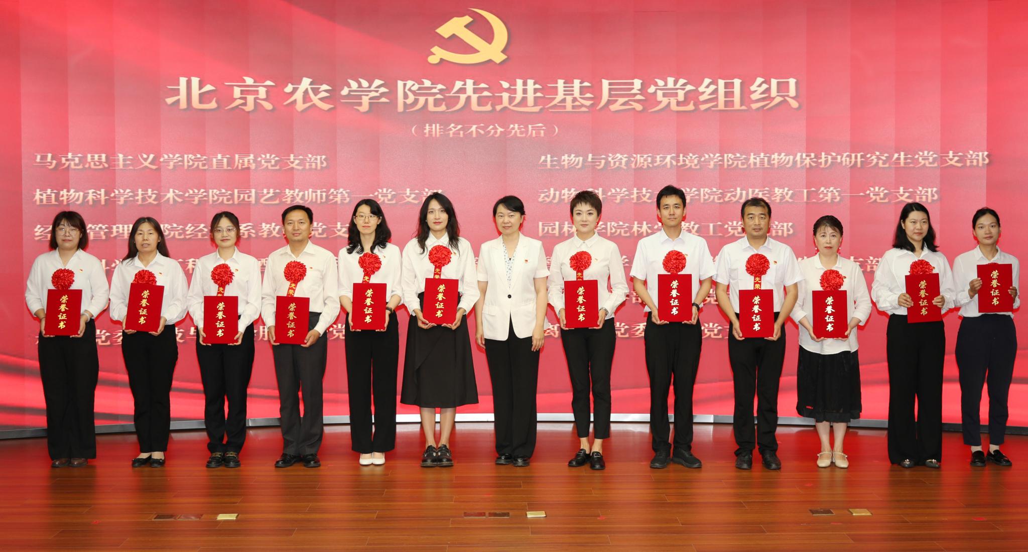 校领导为入选全国高校“双带头人”教师党支部书记“强国行”专项行动团队党支部书记、北京市“六好”离退休干部示范党支部、北京市离退休干部先进个人、2024年北京高校红色“1+1”示范活动获奖支部、学校“两优一先”获奖集体和个人颁奖。