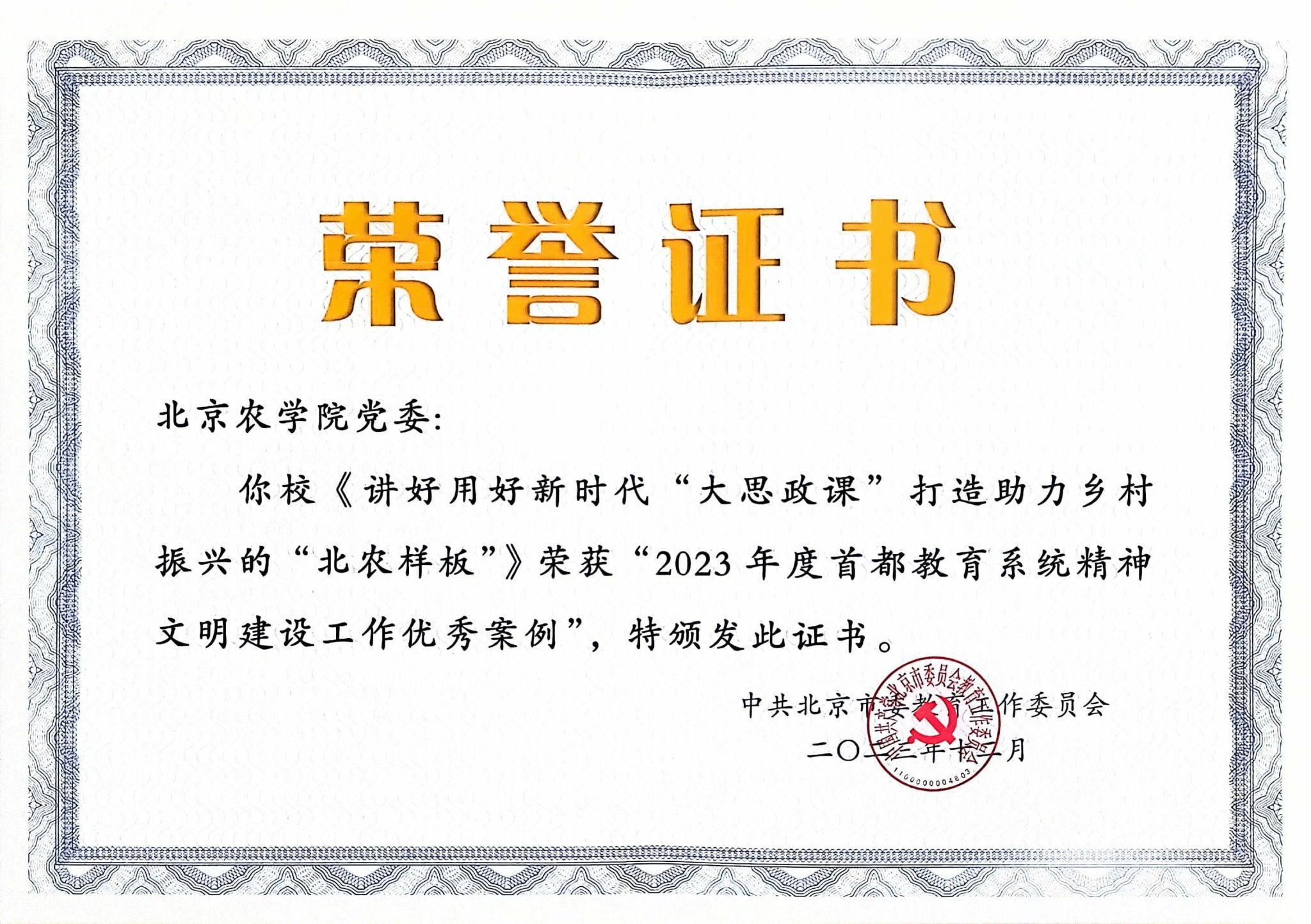 完善“大思政”育人格局。突出“红绿融合”,打造“首善标准、红色基因、北农特色”思政金课,思政课教师团队获北京高校教学创新大赛一等奖、全国二等奖。构建乡村振兴“大思政课”育人体系,乡村振兴“大思政课”案例先后荣获北京高校精神文明建设“十佳案例”、首都教育系统精神文明建设工作“优秀案例”、大学生思想政治工作实效奖、北京市思想政治研究会“优秀案例”、全国高校教育融媒体“典型案例”。