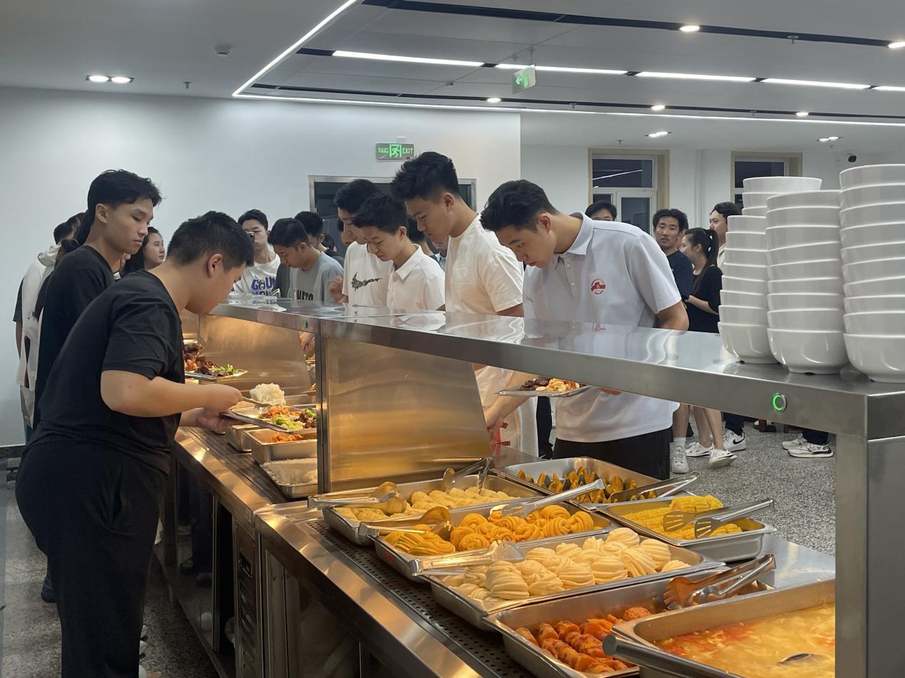 重大活动期间,有这样一支队伍,他们虽不在聚光灯下,也不直接参与展示,却用热气腾腾的饭菜和贴心温馨的服务传递着最质朴的关怀与力量。这就是学校后勤基建处的员工们。他们为89名参与重大活动的师生精准提供餐饮、住宿、洗浴全链条保障,以高度的责任感和使命感,践行以师生为本的服务宗旨。学校食堂量身定制了多套营养菜谱,确保每餐荤素搭配、粗细结合,为师生补充能量。同时推出特设窗口、自助餐、精致盒饭等多样供餐形式,适配活动的不同节奏。从下午两点到凌晨两点,食堂师傅们任劳任怨,用锅勺碰撞的声响,将关爱融入热乎饭菜,一句“必须让孩子们吃好”、“孩子们在为集体拼搏,我们累点不算啥”朴素话语,尽显责任与温情。
