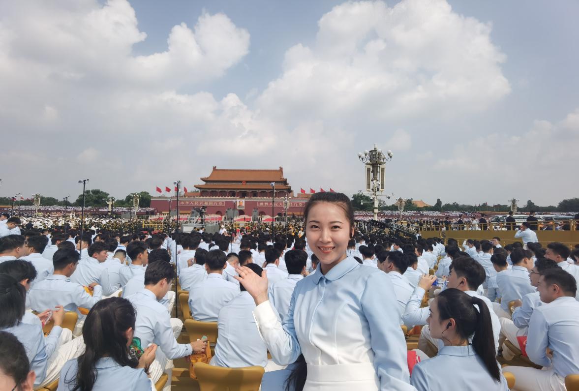梁燕是团委美育中心教师,学生时代她曾参与过庆祝改革开放40周年文艺晚会、庆祝中华人民共和国成立70周年联欢活动、庆祝中国共产党成立100周年大会和第24届冬季奥林匹克运动会开幕式。今年5月份接到国家大型活动通知时,她第一时间提交了申请,通过层层筛选最终成为此次广场合唱中的一员,并担任领队老师、集散指挥长,为了保障任务顺利完成,她主动将婚期从7月推迟了10月。“生逢其时,使命在肩。当个人安排和重大活动冲突时,没什么可犹豫的。”她这样说道。