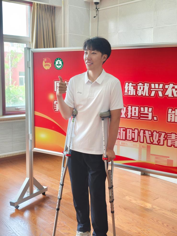 张博文训练中不慎崴脚,即便医生建议静养,他仍拄着拐杖准时到场。从基础动作练习到全流程合排,他始终保持标准姿态,拄拐上下车的身影成为训练场的温暖注脚。“排练是集体的事,我不能掉队”,简单话语里,是对集体荣誉的珍视。