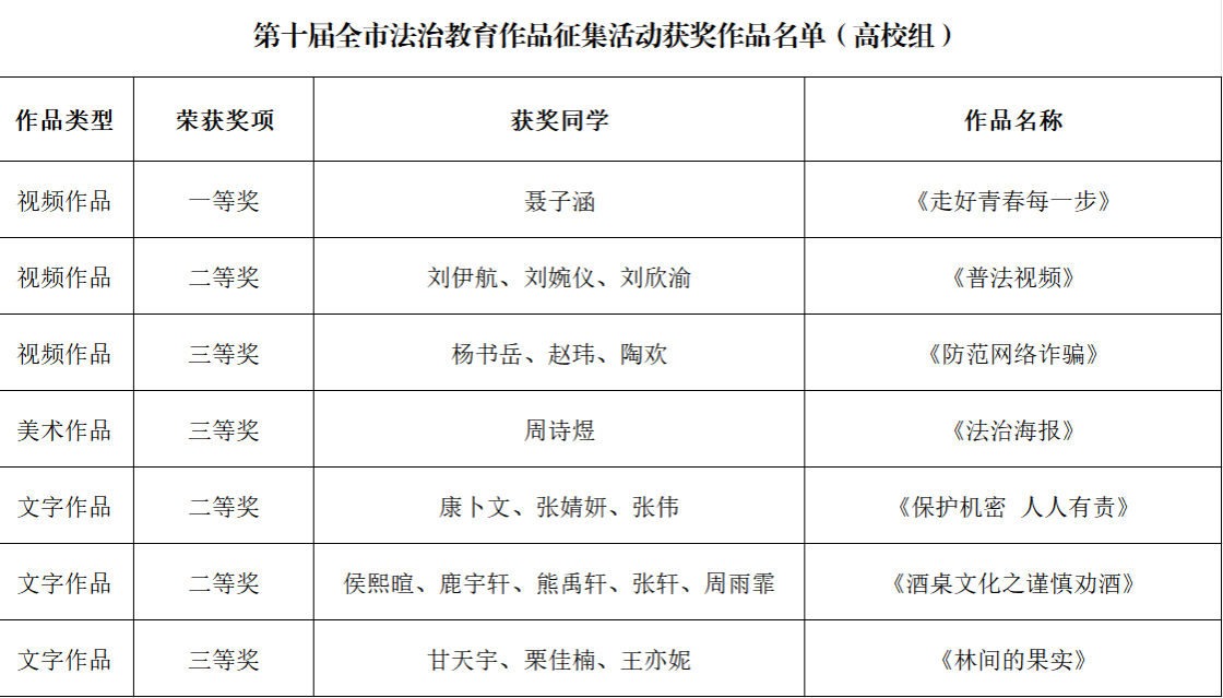 为贯彻落实习近平新时代中国特色社会主义思想和党的二十大精神,充分发挥法治文化的引领作用,北京市教育委员会在全市高校及各中小学学校中开展了第十届全市师生法治教育作品征集活动。近日,文法与城乡发展学院法学系涌现出7个优秀团队,参赛学生在视频作品、美术作品、文字作品多领域均斩获奖项,这次的荣誉不仅是对师生团队智慧和辛勤努力的最好奖赏,更是对学院法治教育水平的高度认可。