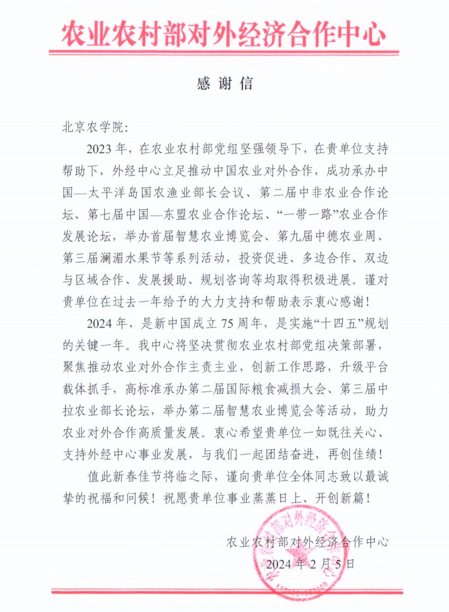 近日,农业农村部对外经济合作中心向best365发来感谢信,感谢best365官方网站对农业农村部对外经济合作中心工作的支持。