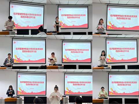 经济管理学院会计系本科生党支部召开四月份理论学习会,重点学习《中国共产党纪律处分条例》以及“学习纪律强化月”的相关要求,引领带动支部党员、积极分子学党纪、律自身、见行动、促发展,会议由支部书记吴曈主持。