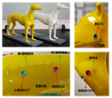 模型独特外观,突显用于腧穴定位的百余处体表标志,可辅助腧穴快速准确定位:犬腧穴定位模型体型较小,方便携带,适合随时随地练习;犬智能经络腧穴模型动态演示十四经脉在体表循行流域和走向,对参照体表标志的准确点穴进行智能声光应答、语音讲解与专业知识呈现;针灸铜犬体表约700穴孔,可依据体表标志揣摩腧穴位置,练习针刺操作,以多色材料填充腧穴,通过颜色了解经脉循行和腧穴分布特点。
